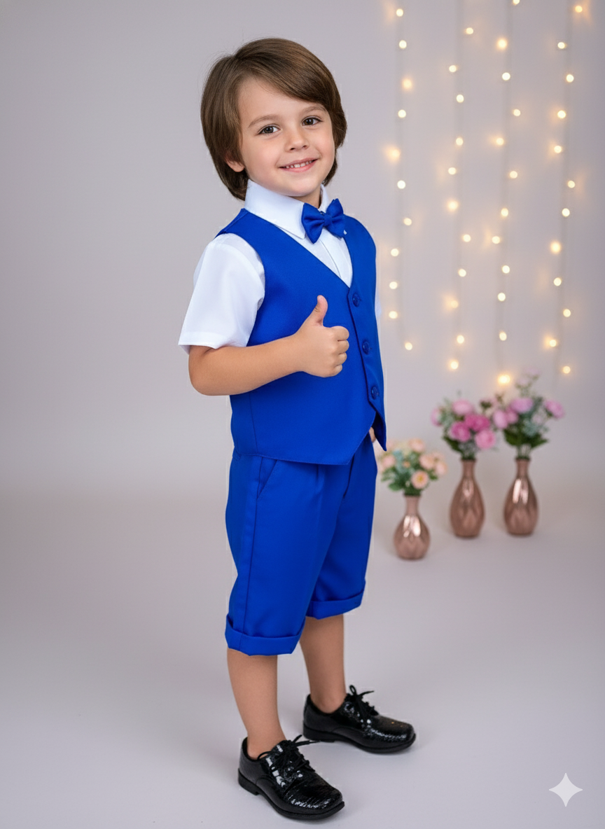Conjunto composto por: Camisa social na cor Branca, gravata borboleta Azul Royal, Shorts na cor azul royal, colete na cor azul royal e cinto preta.