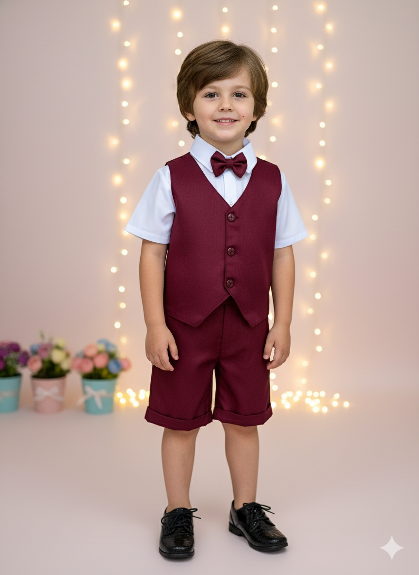 Conjunto composto por: Camisa social na cor Branca, gravata borboleta MARSALA shorts na cor MARSALA, Colete MARSALA e Cinto PRETO