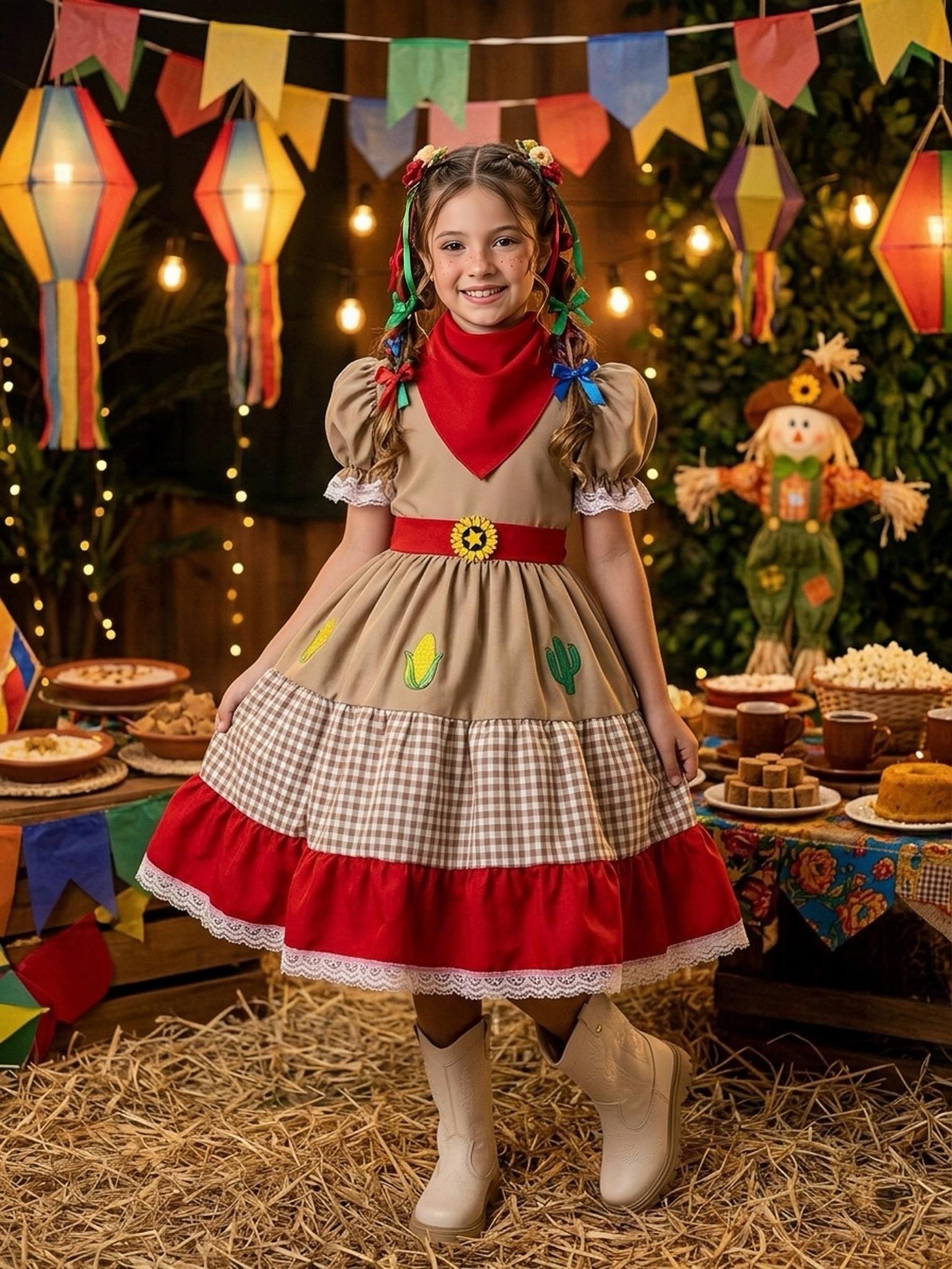 A saia é rodada e em camadas, proporcionando volume e movimento. A primeira parte da saia mantém o tom bege e conta com apliques bordados de elementos do campo, como milho e cacto, reforçando a temática rural. Logo abaixo, há uma faixa em tecido xadrez bege e branco, clássica das roupas juninas.