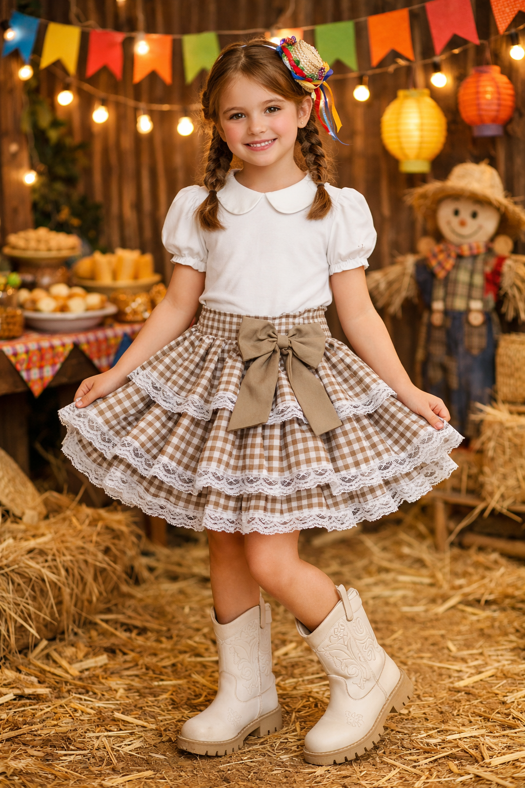 A saia é confeccionada em tecido xadrez vichy na cor bege e branco, trazendo um visual clássico e delicado típico das festas juninas. O modelo possui três camadas de babados sobrepostos, que criam bastante volume e movimento, deixando a peça rodada e muito graciosa.