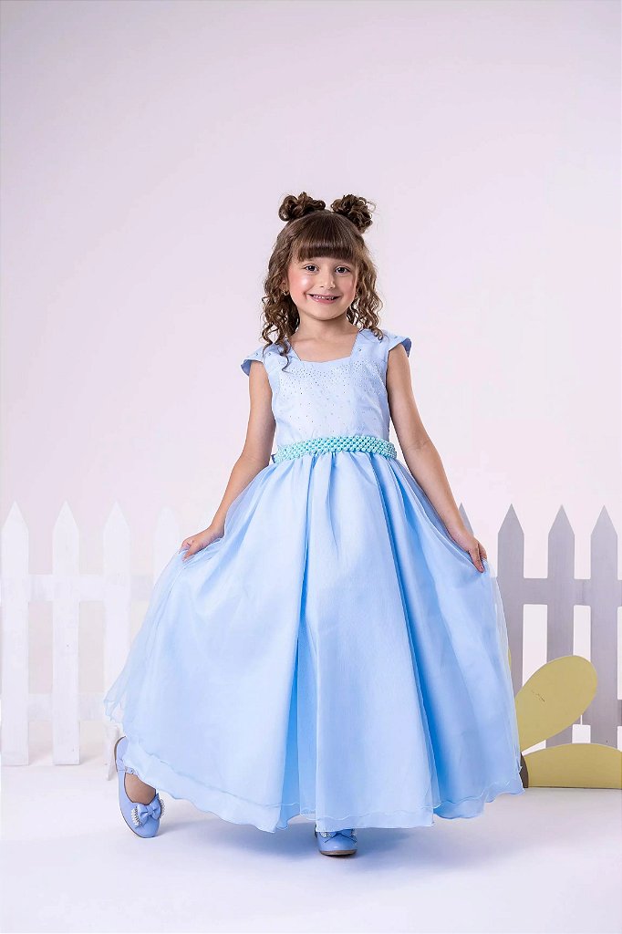Vestido Infantil Azul Bebe Cinto Perolas Longo Tule