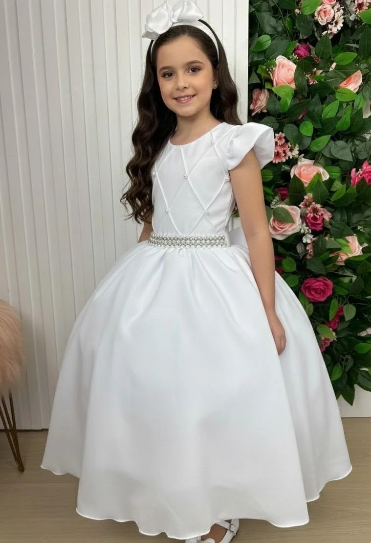 Confeccionado em tecido misto possui forro em poliéster e algodão para não incomodar a criança e proporcionando um caimento incrível e sofisticado, possui gola redonda, comprimento médio, mangas curtas, contém, também, elástico nas costas para melhor ajuste, acabamento com lindo laço na parte posterior do vestido completa o look dos sonhos!