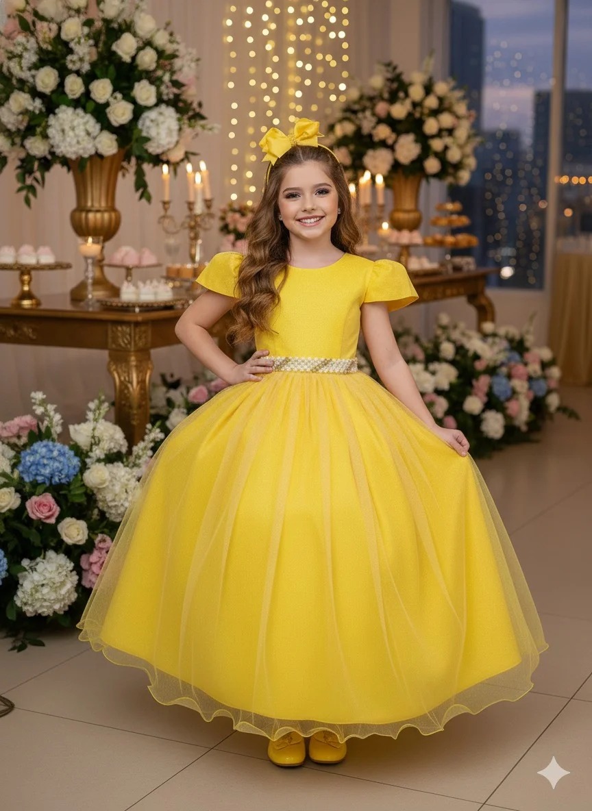 Confeccionado em tule com brilho suave, o modelo traz um caimento leve e elegante, com mangas e corpete estruturado que valoriza o visual clássico. O destaque vai para o cinto de pérolas entrelaçadas, que adiciona um toque de luxo e luminosidade à peça.