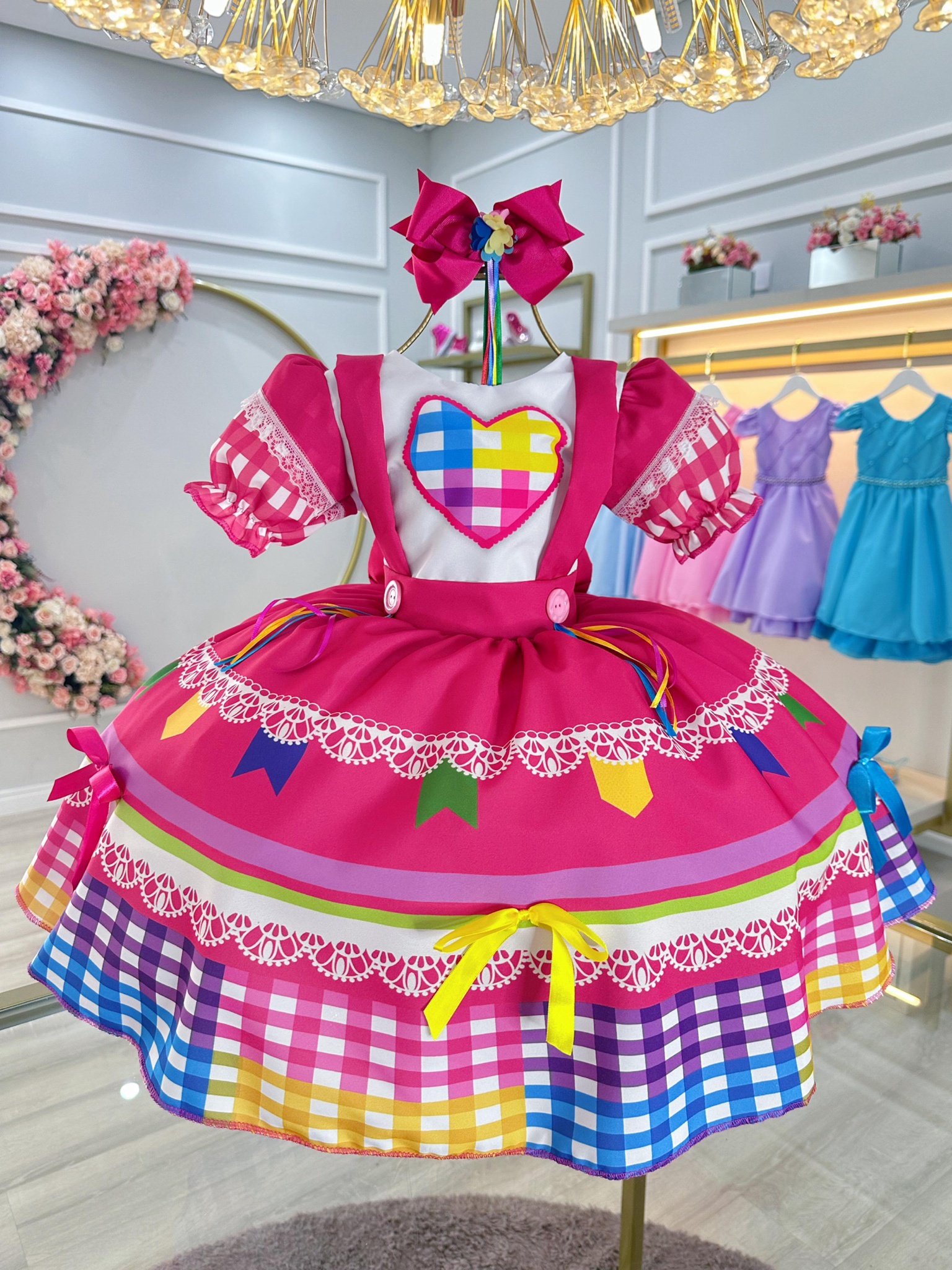 Vestido Infantil Junino Caipira Arraiá Pink Colorido Luxo