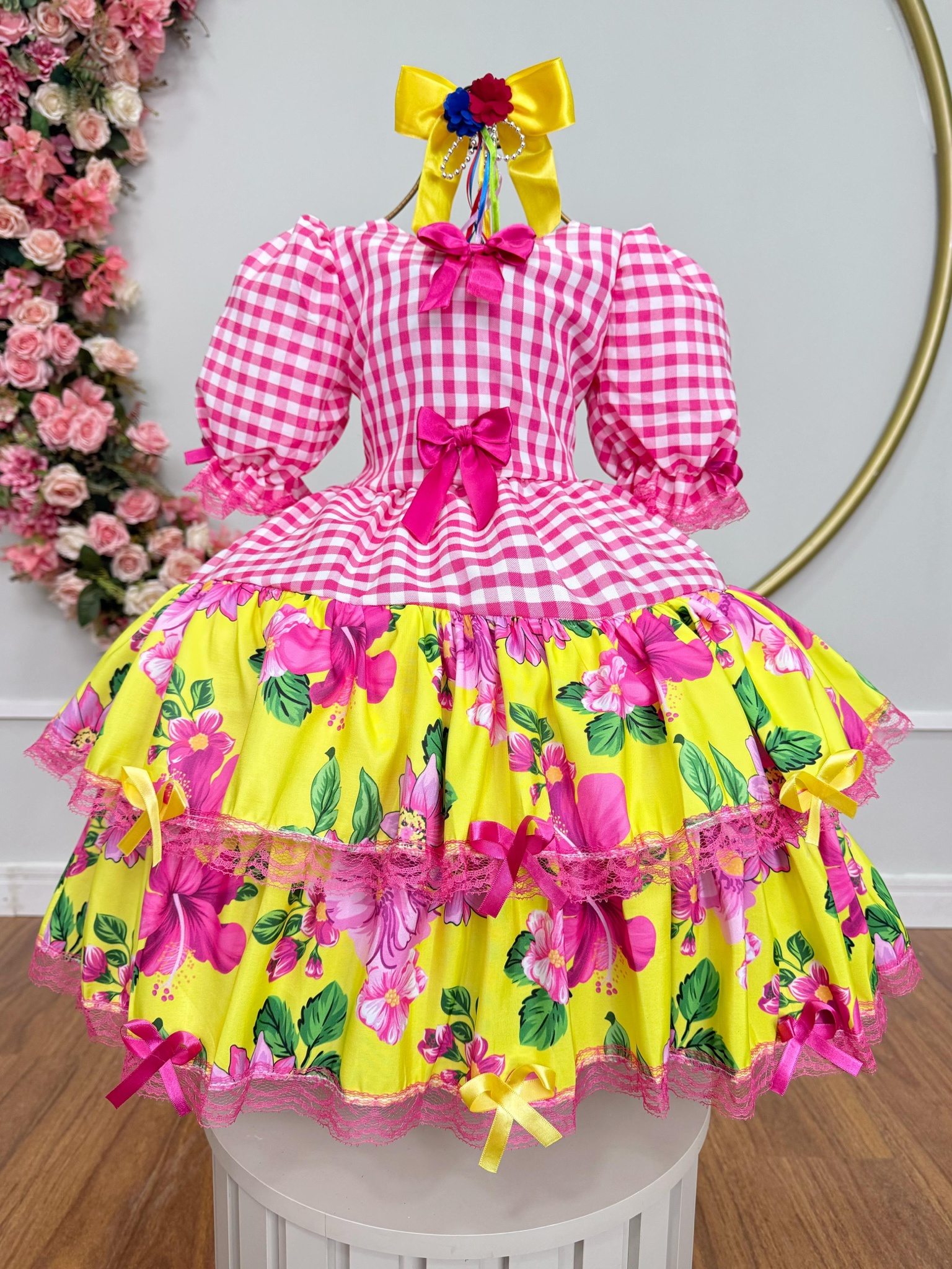 Vestido Infantil Junino Caipira Xadrez Rosa e Amarelo Florido