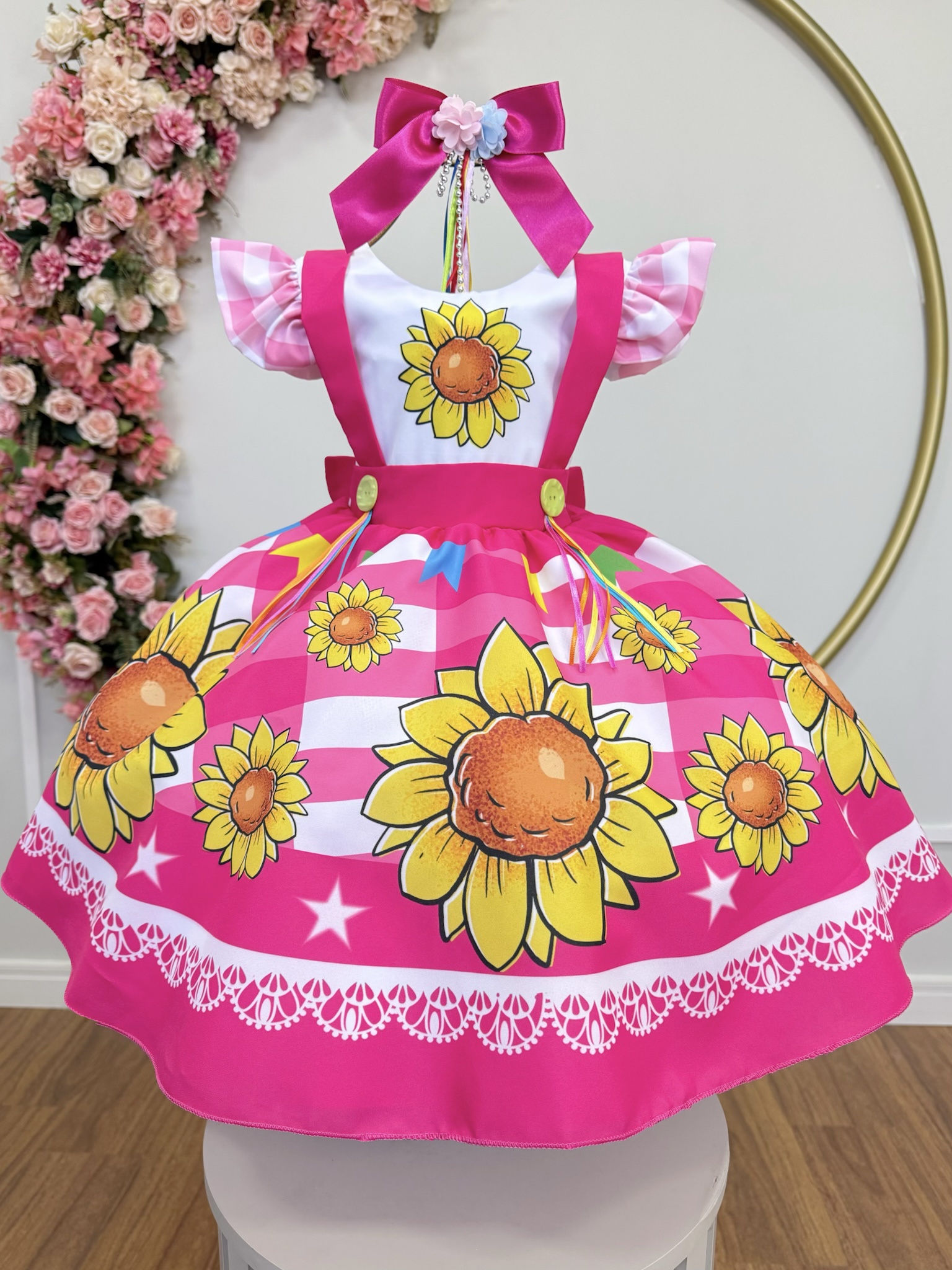A saia é rodada e volumosa, ideal para dar movimento e leveza, com estampa de girassóis em fundo xadrez, além de detalhes coloridos que enriquecem o design. A barra possui acabamento delicado, garantindo um toque especial ao vestido.
