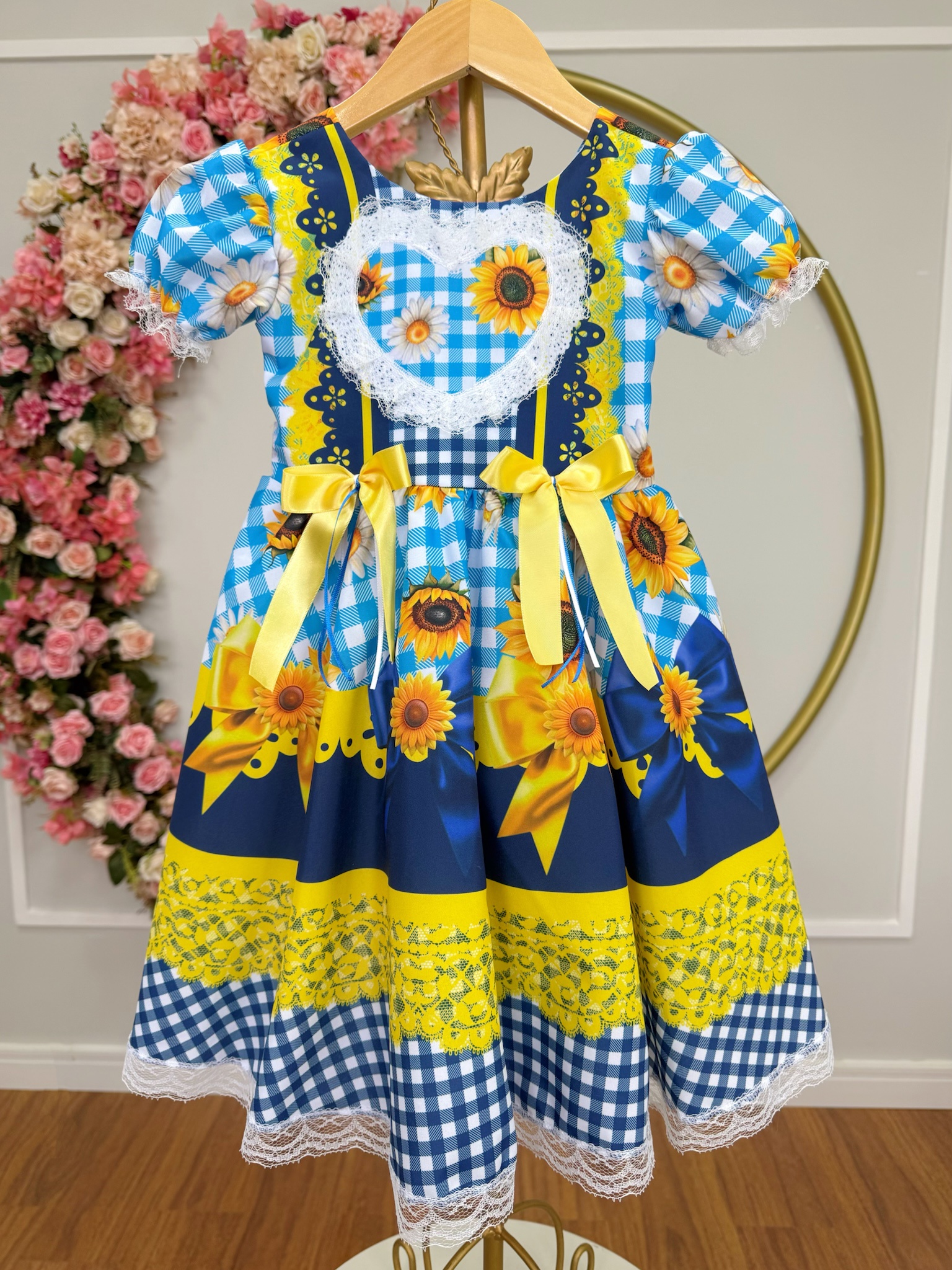 Vestido Infantil Junino Xadrez Caipira Azul Girassol Luxo