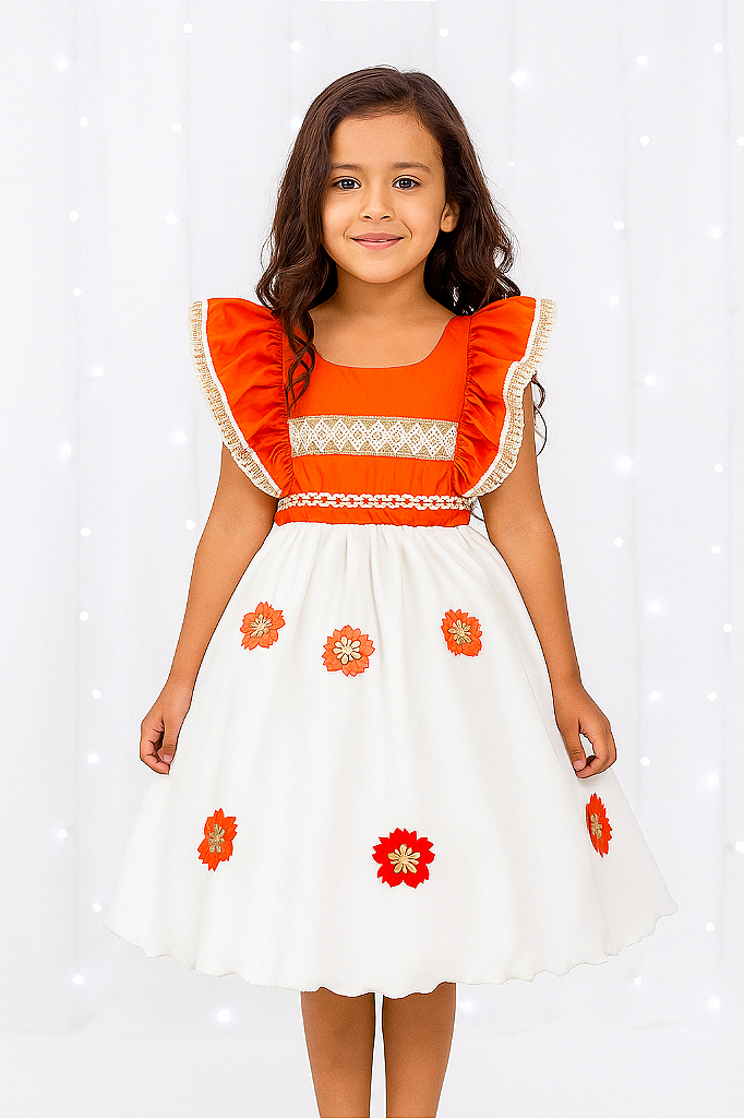 Vestido Infantil Moana Laranja Apliques Flores Festas