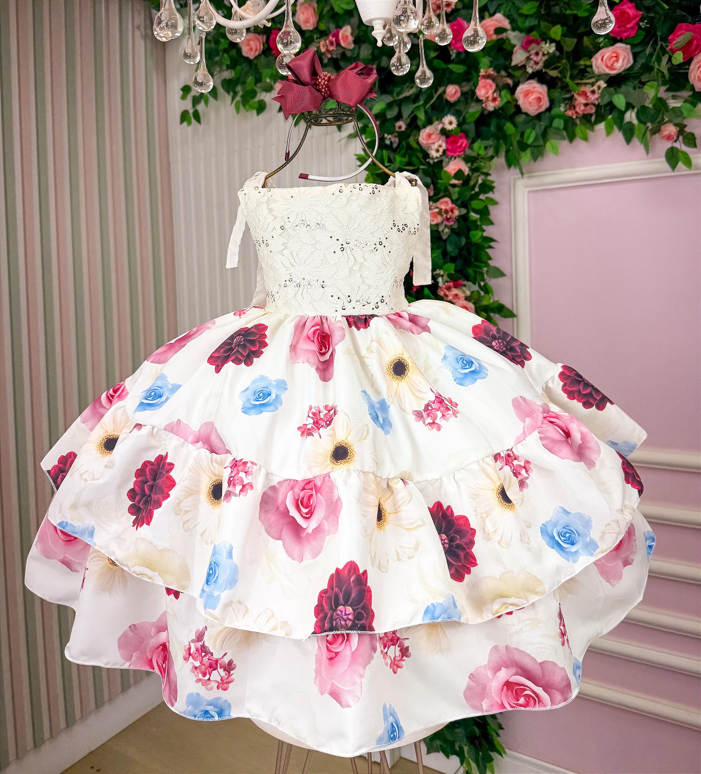 O vestido apresenta estampa floral colorida em tons de rosa, azul e vermelho, trazendo frescor e charme ao visual. O busto é confeccionado em renda branca com aplicações delicadas de paetês, que adicionam brilho sutil e sofisticado.
