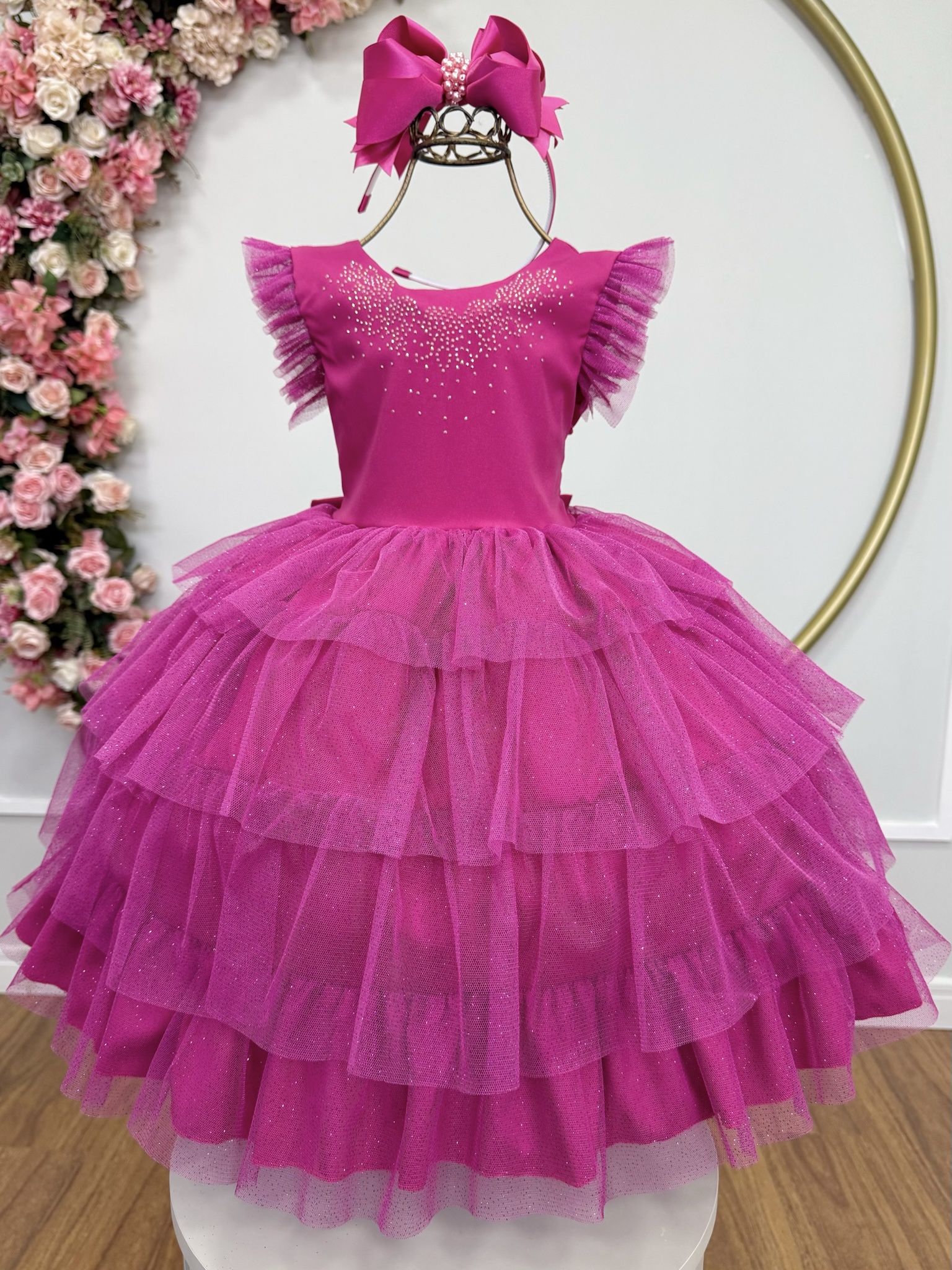 Vestido Infantil Pink Busto Strass Saia Babados Daminhas