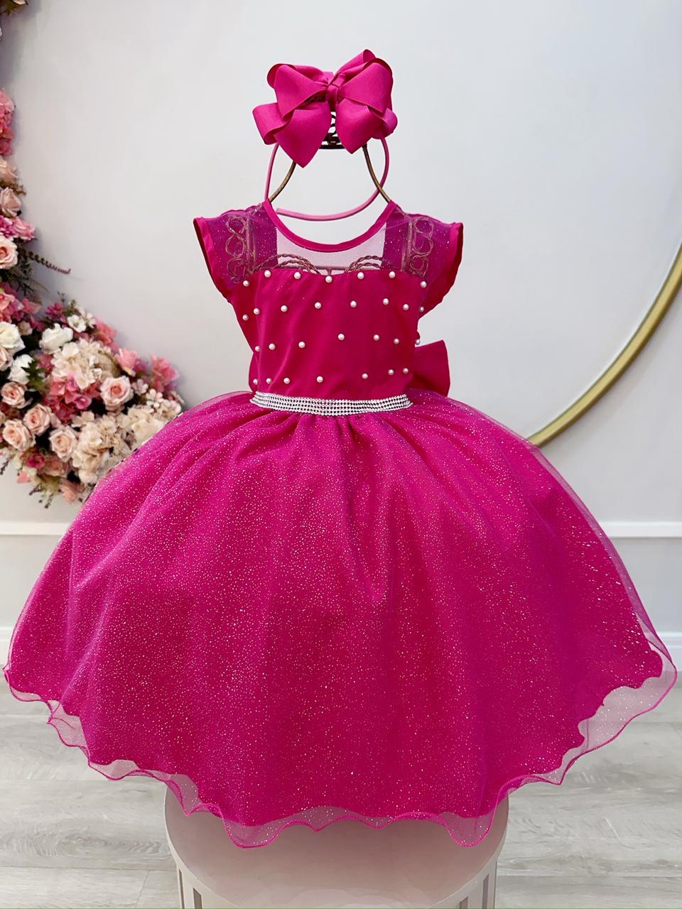 Vestido Infantil Pink com Pérolas Saia Glitter Daminhas